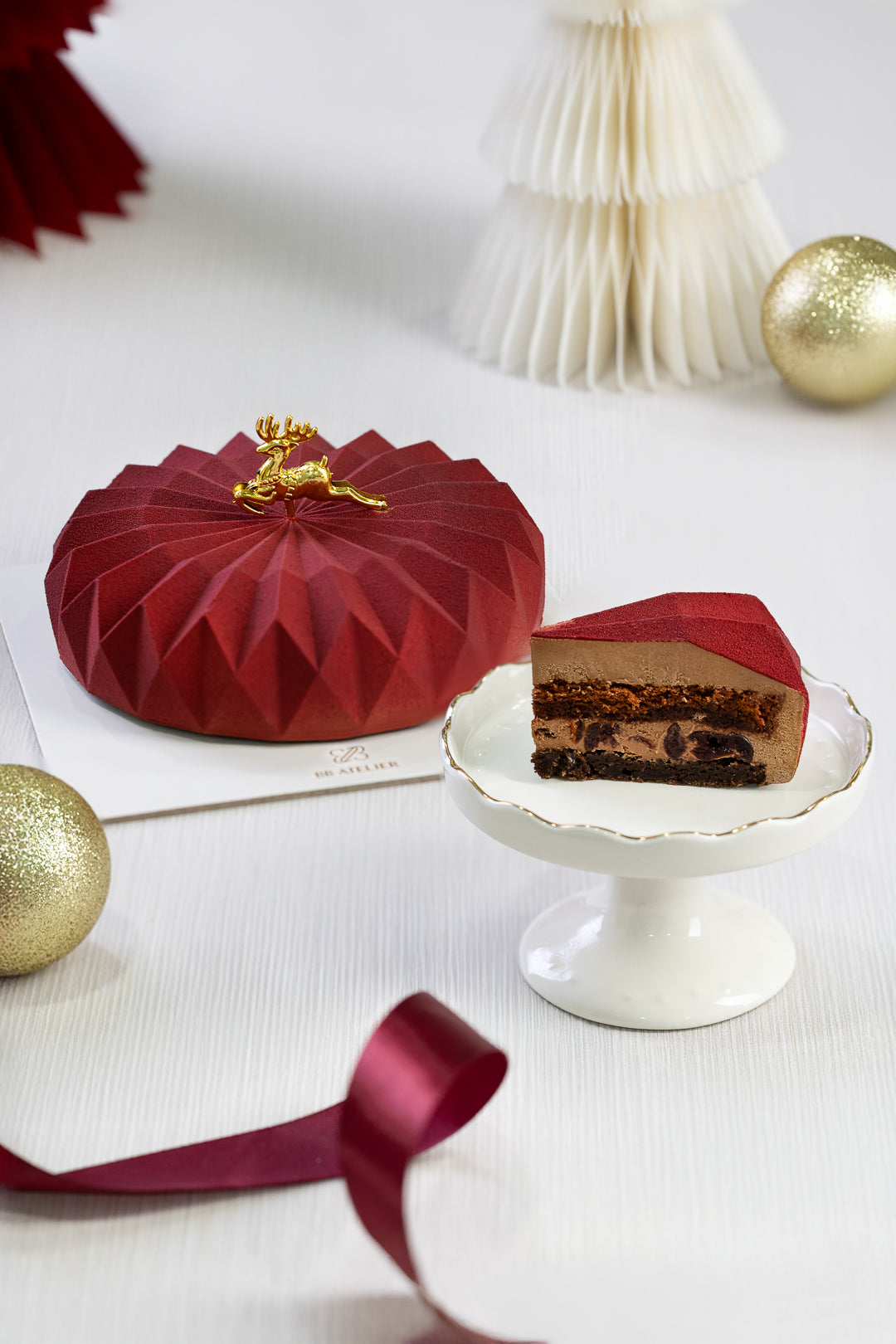 Savor the intense, festive decadence of our redefined classic. Immerse yourself in the deep flavor of both chocolate & dark chocolate, balanced by the tangy burst of cherry compote. Finished in a rich, festive red velvet spray and crowned with a delicate golden reindeer, this Origami Cake elevates the iconic Chocolate with Black Forest flavor into a luxurious work of art.